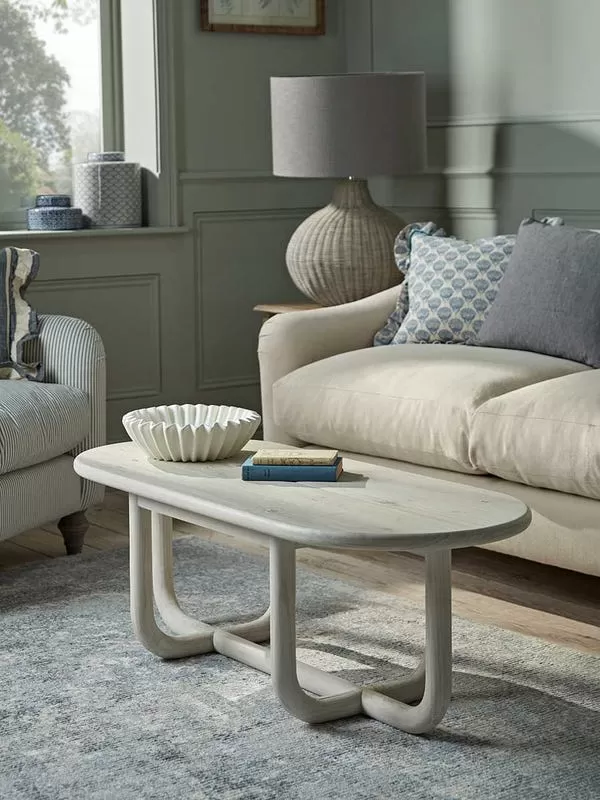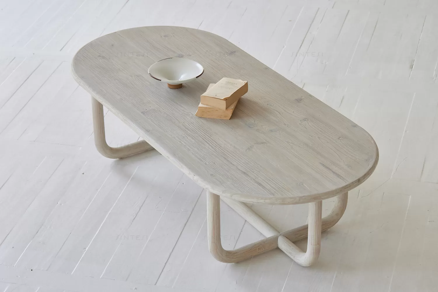 طاولة قهوة بيضاء بتصميم بيضاوي عصري وخشب صنوبر طبيعي