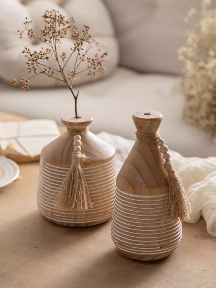 فازة ديكور خشبية طبيعية بحجمين مع زينة خرز وخيوط